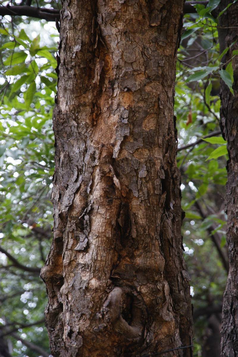 山地に多く生え、高さは20mほどになります。葉の長さは8〜20cmですが葉柄が2〜4cmと長めです。カシの中では全縁なのが特徴的です。5〜6月に花が咲き、多数の雄花序がヒモのように垂れ下がります。雌花序は新しい枝の葉腋から出ますが、長さが1cmもなく目立ちません。雄花序も雌花序も軟毛で覆われています。実はドングリで、花が咲いてから2年目の秋に成熟します。樹皮は緑灰黒色ですが、老木になると鱗のようにはがれて橙色や茶色のまだら模様になります。[1][2][3]